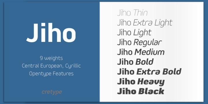 Jiho is versatile type family of 18 fonts. Jiho family consists of 9 weights (Thin, ExtraLight, Light, Regular, Medium, Bold, ExtraBold, Heavy & Black) with their corresponding italics.